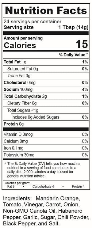 Mandarin Orange, Tomato, Vinegar, Carrot, Onion, Non-GMO Canola Oil, Habanero Peppers, Garlic, Sugar, Chili Powder, Black Pepper, Salt