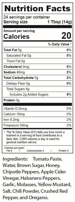 Tomato Paste, Water, Brown Sugar, Honey, Chipotle Peppers, Apple Cider Vinegar, Habanero Peppers, Garlic, Molasses, Yellow Mustard, Salt, Chili Powder, Crushed Red Pepper, Oregano