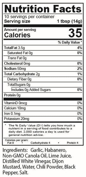 Garlic, Habanero Peppers, Non-GMO Canola Oil, Lime Juice, Distilled White Vinegar, Dijon Mustard, Water, Chili Powder, Black Pepper, Salt