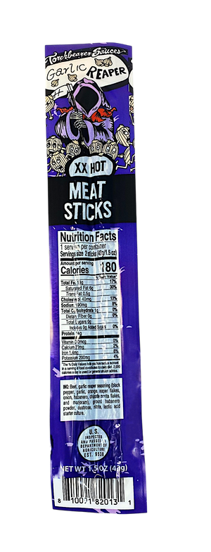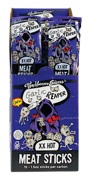 We took the bold heat of our Garlic Reaper hot sauce and turned it into a powerful, protein-packed snack. Made in collaboration with Weaver’s of Wellsville, each pack contains two spicy meat sticks infused with real Carolina Reaper peppers and savory garlic flavor. Perfect for road trips, lunch boxes, or anytime you need a flavorful kick, these sticks bring serious heat in a compact, delicious package. As always, we don’t mess around with spice—consider yourself warned.