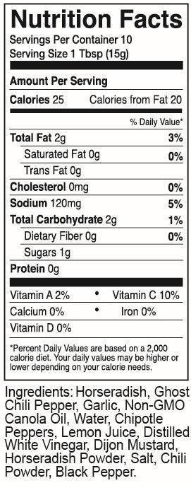 Horseradish, Ghost Chili Peppers, Garlic, Non-GMO Canola Oil, Water, Chipotle Peppers, Lemon Juice, Distilled White Vinegar, Dijon Mustard, Horseradish Powder, Salt, Chili Powder, Black Pepper