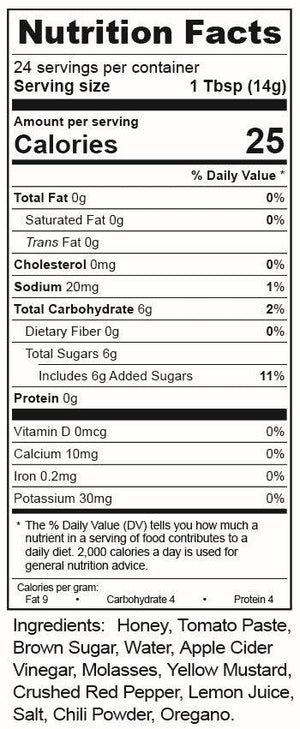 Honey, Tomato Paste, Brown Sugar, Water, Apple Cider Vinegar, Molasses, Yellow Mustard, Crushed Red Pepper, Lemon Juice, Salt, Chili Powder, Oregano