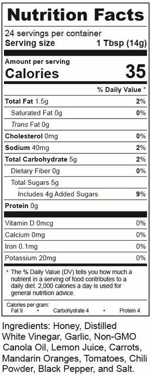 Honey, Distilled White Vinegar, Garlic, Non-GMO Canola Oil, Lemon Juice, Carrots, Mandarin Oranges, Tomatoes, Chili Powder, Black Pepper, Salt