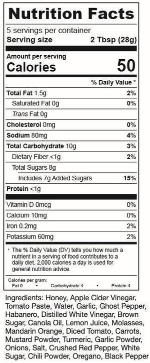 Honey, Apple Cider Vinegar, Tomato Paste, Water, Garlic, Ghost Chili Peppers, Habanero Peppers, Distilled White Vinegar, Brown Sugar, Non-GMO Canola Oil, Lemon Juice, Molasses, Mandarin Orange, Diced Tomatoes, Carrots, Mustard Powder, Turmeric, Garlic Powder, Onions, Salt, Crushed Red Pepper, White Sugar, Chili Powder, Oregano, Black Pepper