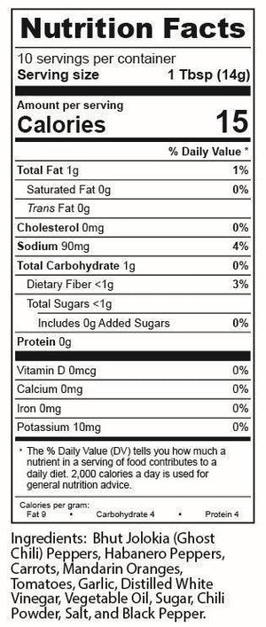Ghost Chili Peppers, Habanero Peppers, Carrots, Mandarin Oranges, Tomatoes, Garlic, Distilled White Vinegar, Non-GMO Canola Oil, Sugar, Chili Powder, Salt, Black Pepper