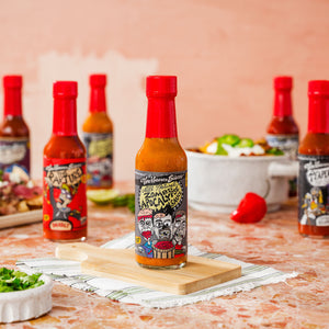 Featured in seasons 3 and 4 of Hot Ones, our original super hot sauce is packed with fresh Bhut Jolokia peppers (aka the ghost pepper) and habañero peppers for an intense, life-altering heat. But our Bhut Jolokia pepper sauce isn’t just spicy to be spicy. The flavor: off the charts. All you hot heads out there will appreciate the heat and be wowed by how delicious it still is. Trust us, spicy’s never tasted this good.