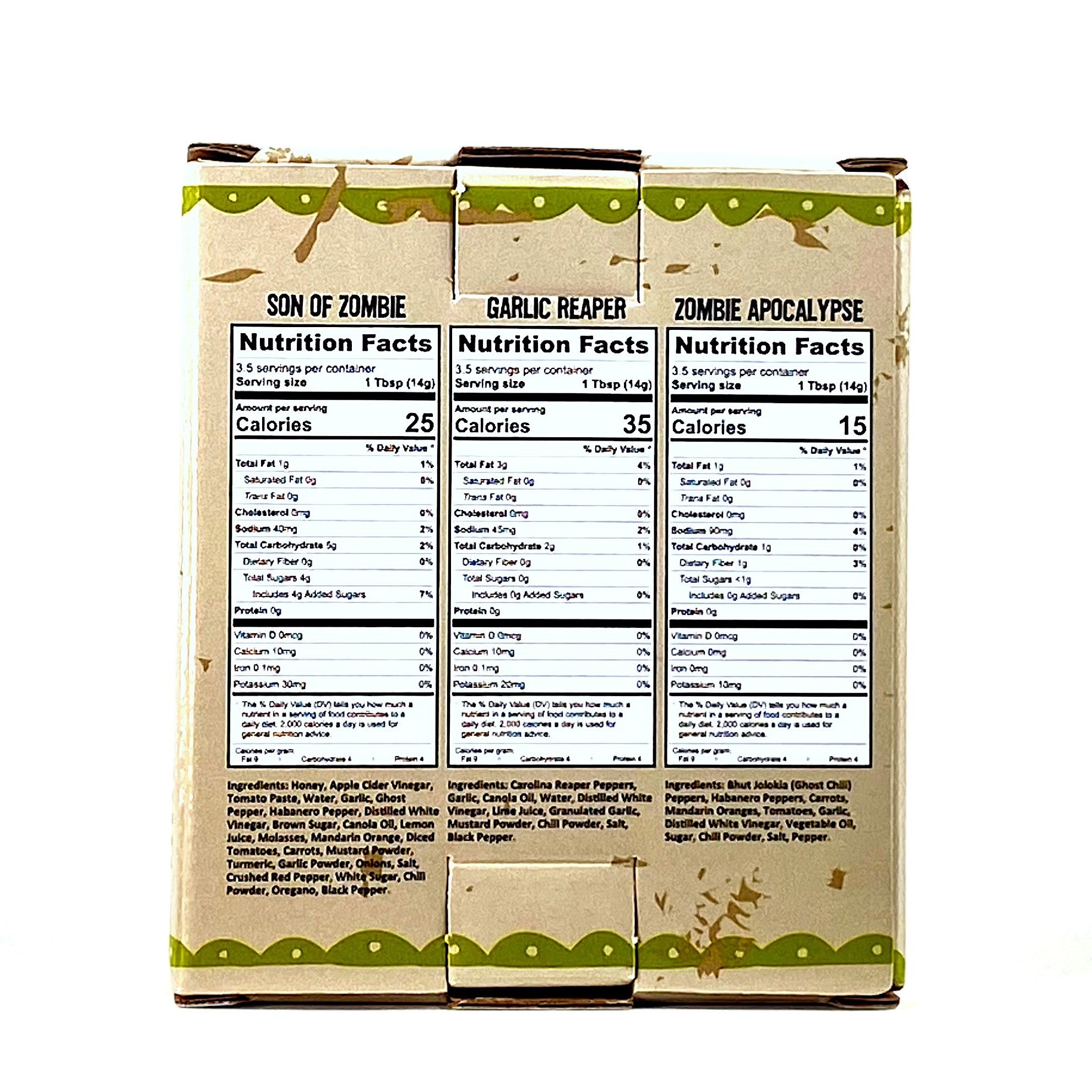 Cute little baby bottles with serious, grown-up heat. The first 3 sauces we had on Hot Ones are together in this pack of minis, perfect for gifting or keeping on you for any sudden sauce need. You get a 1.75oz bottle of Son of Zombie, Zombie Apocalypse, and Garlic Reaper.