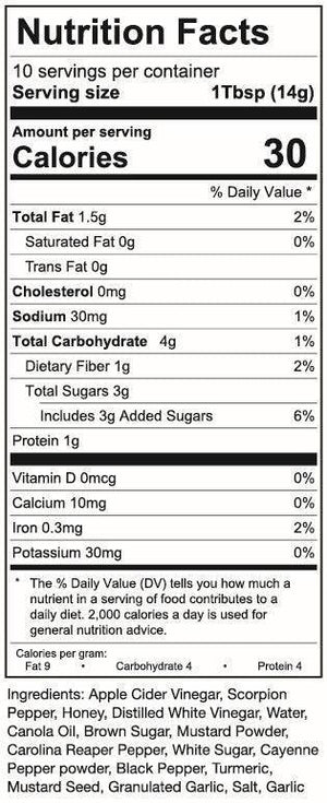 Apple Cider Vinegar, Scorpion Peppers, Honey, Distilled White Vinegar, Water, Non-GMO Canola Oil, Brown Sugar, Mustard Powder, Carolina Reaper Peppers, White Sugar, Cayenne Pepper Powder, Black Pepper, Turmeric, Mustard Seed, Granulated Garlic, Salt, Garlic