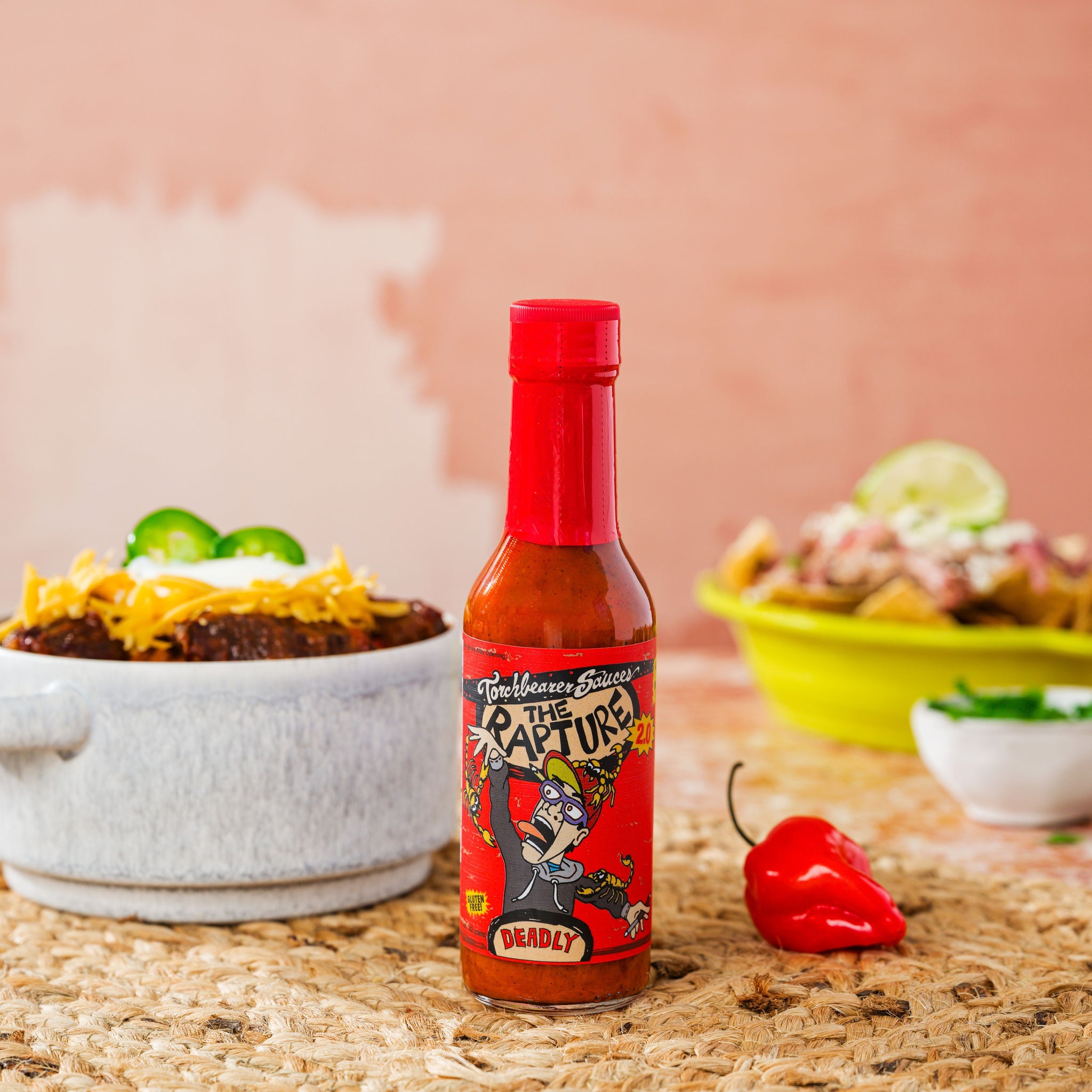 Made with a bit of Reaper Pepper, a heap of Moruga and Trinidad Scorpion Peppers, and some Ghost Peppers and Habaneros (you know, for flavor), The Rapture™ is going to make even the biggest super-hot sauce fanatic stop for a moment and contemplate their life choices. Remember, as with all Torchbearer products, heat can be very important, but flavor is number one—and this sauce has plenty to spare. Brave souls will throw it on a crab cake, sushi, or nachos, while others may add a teaspoon or two to their pot of homemade veggie soup or chili. Don’t be “left behind.” Get ready to enjoy the tastiest, freshest, and one of the most extreme hot sauces this world has to offer.