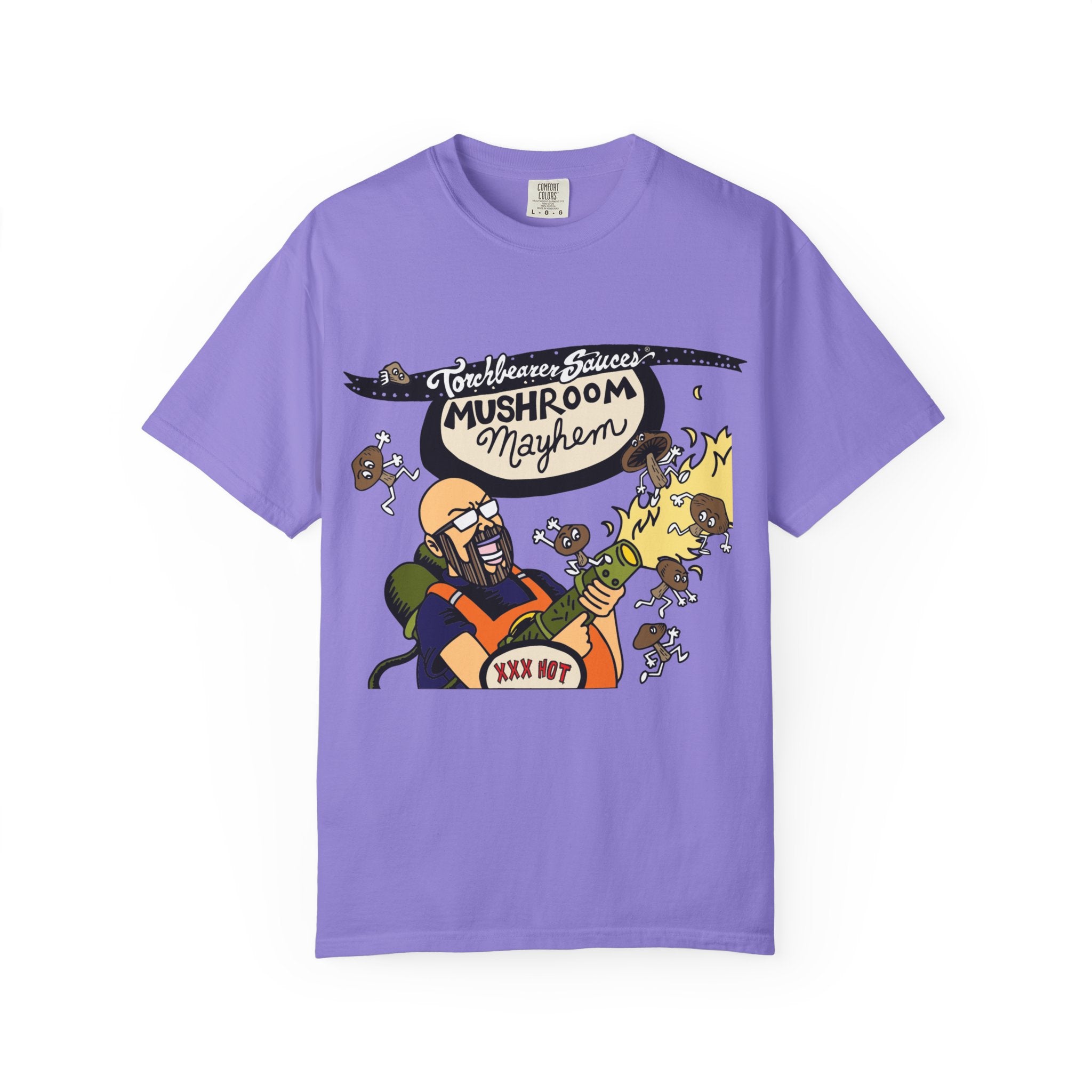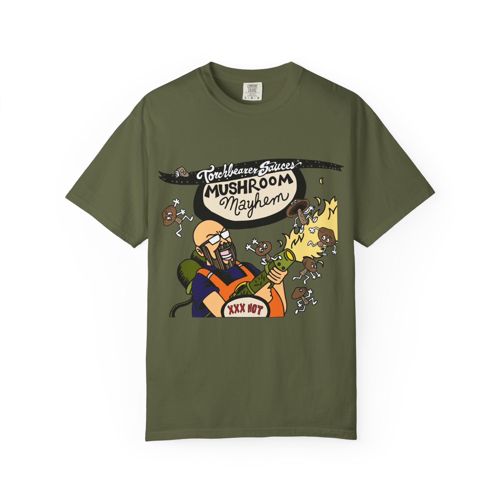 Torch those 'shrooms with us in our fresh and fun Mushroom Mahyhem tee. If you like umami steak sauces with some real heat, show it off with pride. Our label art is perfect for everyday wear and the shirt is sturdy and soft. Show our character artist he's the best and grab one of these now! This item is shipped separately and is not part of our "free shipping at $75" promotion