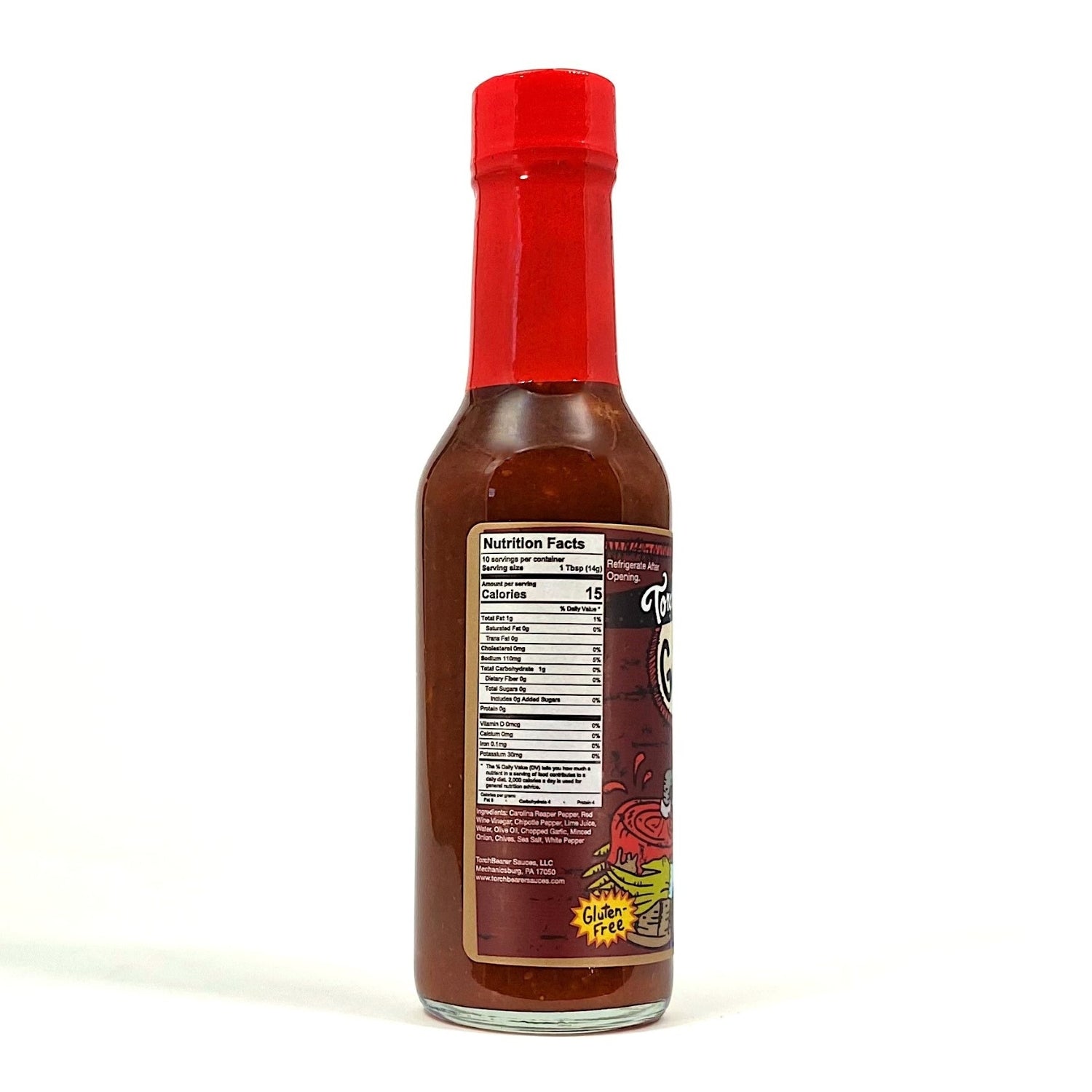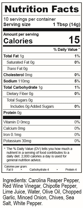 Carolina Reaper Pepper, Red Wine Vinegar, Chipotle Pepper, Lime Juice, Water, Olive Oil, Chopped Garlic, Minced Onion, Chives, Sea Salt, White Pepper