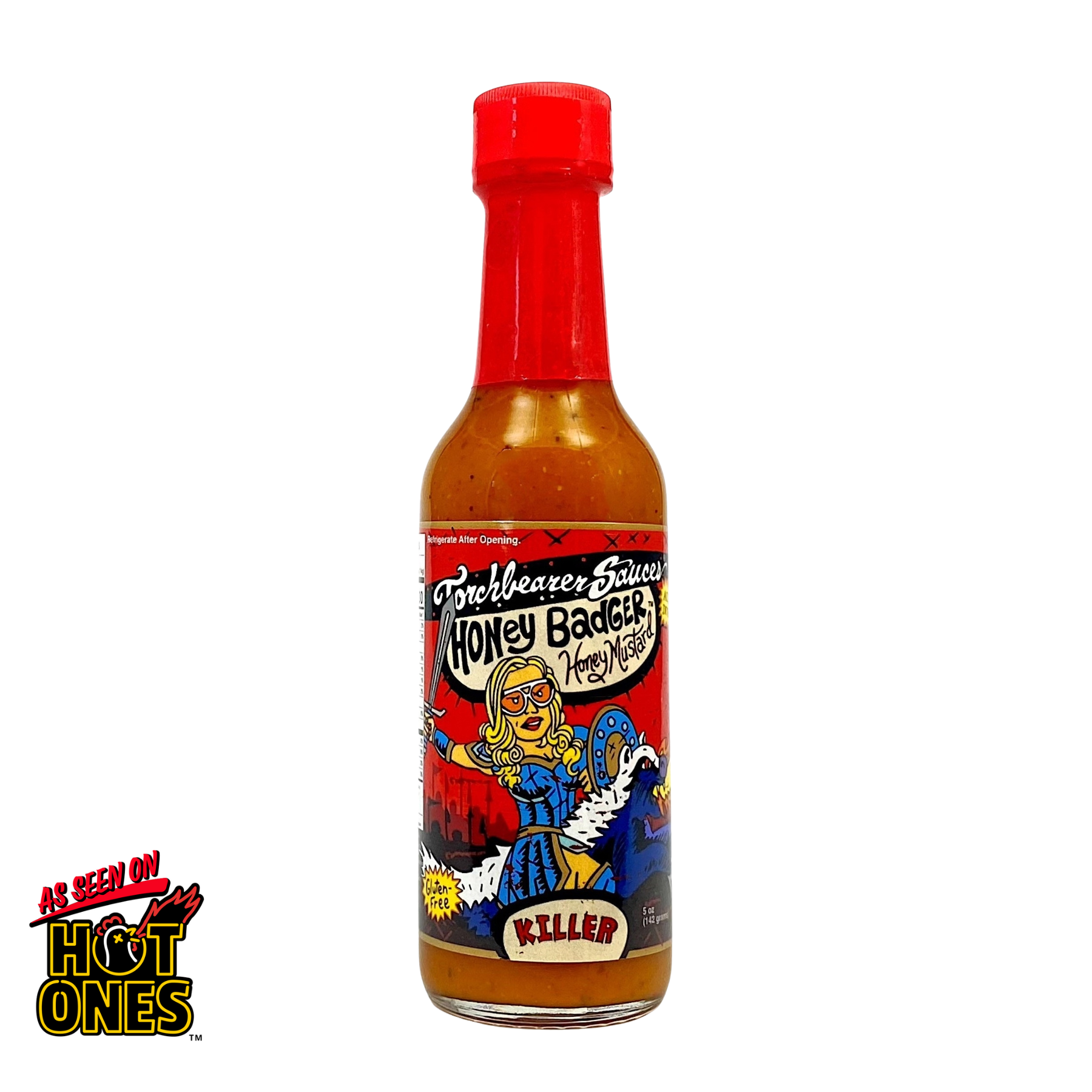 Featured on season 14 of Hot Ones, this firecracker of a honey mustard-reaper pepper sauce brings some bold flavor and even bolder heat. At first, you’ll think, hey, this mustard sauce is sweet ‘n’ delicious—grandma will love it. But then, the Scorpion and Reaper Peppers come out and leave behind a ferocious fire that’ll burn so good. You haven’t tried spicy mustard ‘til you’ve tried Torchbearer.