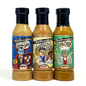 Our Oh My Garlic sauce really put us on the map all those years ago and has since been the base for tons of other sauces. Now you can have a little satchel of garlicky goodness all for yourself! The Oh My Garlic is savory and mild, the Smokey Horseradish is spicy and smokey, and the Psycho Curry has that eastern curry flavor everyone loves. You can't go wrong here!
