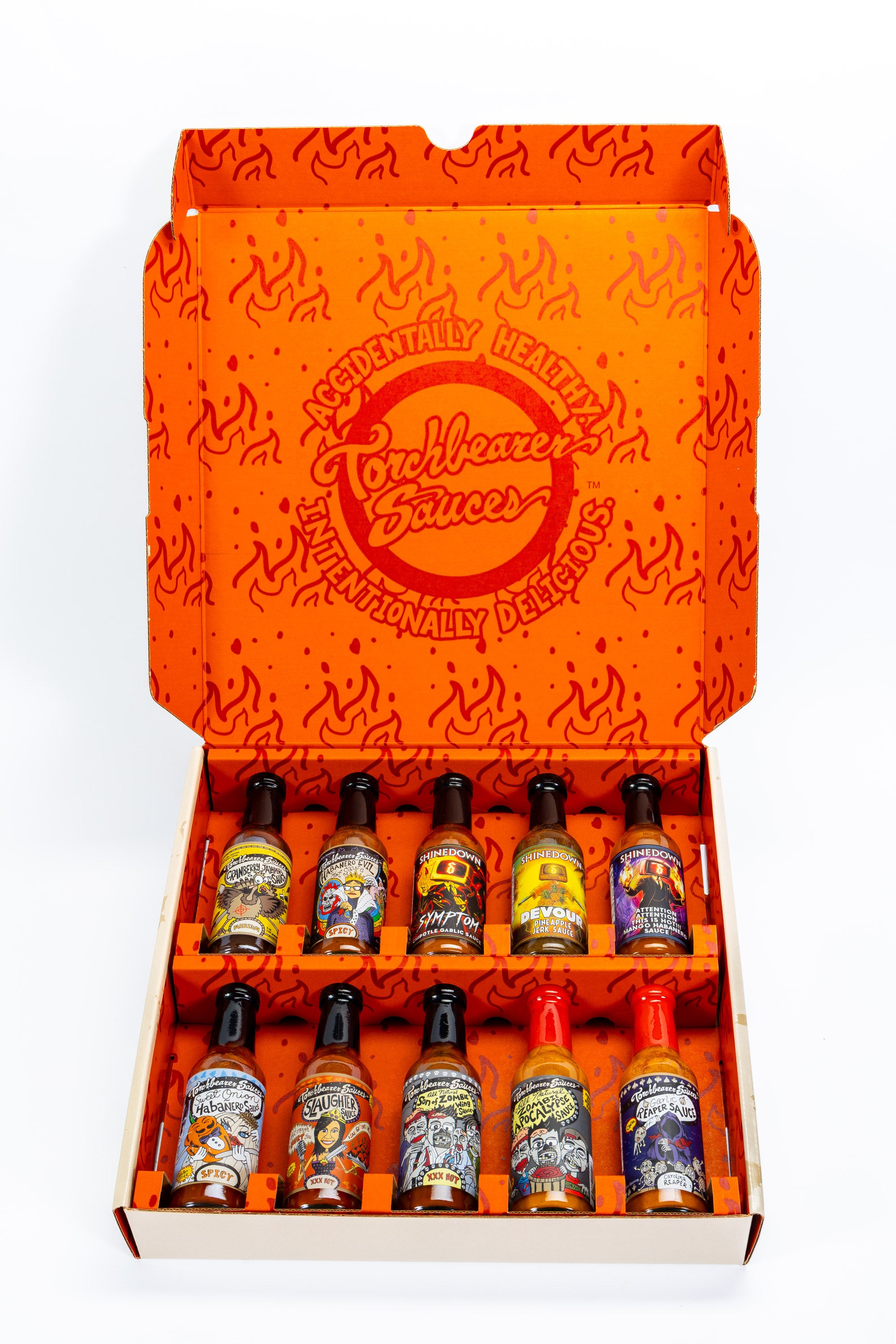 Another mix of our awesome sauces, featuring Shinedown this time, is here and ready to go! This is the best way to try out our range of flavors and heat in a sturdy, fun package featuring lots of our characters. Makes a great gift, too!