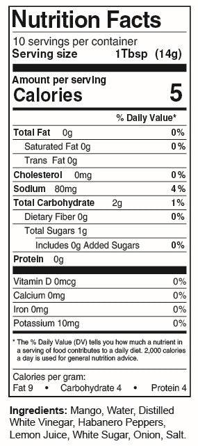 Mango, Water, Distilled White Vinegar, Habanero Peppers, Lemon Juice, White Sugar, Onion, Salt