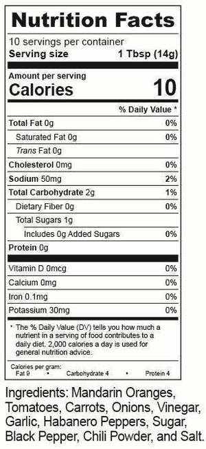 Mandarin Oranges, Tomatoes, Carrots, Onions, Vinegar, Garlic, Habanero Peppers, Sugar, Black Pepper, Chili Powder, Salt