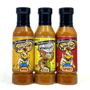 It's wing night for all with this useful sack-o-sauce! Whether you want traditional wings with a tiny bite, smokey wings with a good kick, or a savory/sweet wing, this collection has you covered. Every sauce has been extensively tested (by that we mean we ate a bunch) and approved for wings that almost anyone can enjoy. What are you waiting for?